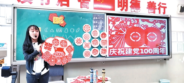 本报记者王家隆 太原市滨河小学剪纸课上,老师正在为同学们讲解党的发展历程。老师和同学们一起制作了一幅团花,寓意“团团圆圆”,通过自己的作品祝愿祖国繁荣昌盛,以别样的方式为建党百年献上一份特殊的礼物。