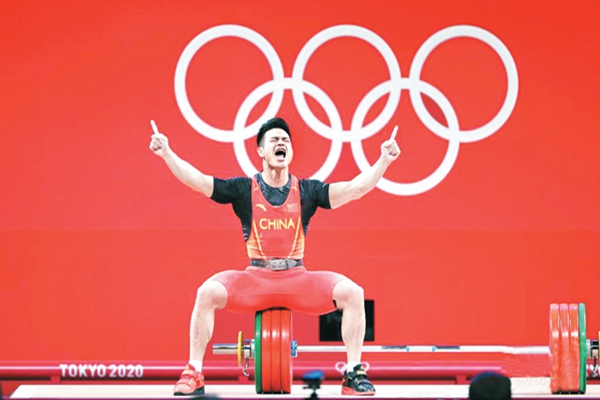 7月28日,中国选手石智勇在比赛中。当日,在东京奥运会举重男子73公斤级决赛中,中国选手石智勇夺冠。
