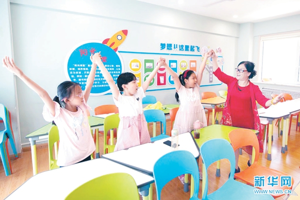 近日,在杏花岭区域党群服务中心,辅导老师姬静(右)为小朋友上声乐课。暑假以来,位于山西省太原市杏花岭区的杏花岭区域党群服务中心通过“社区+第三方+志愿者”的形式,免费为孩子们提供声乐、书法、环保等课程和活动,丰富了孩子们的暑期生活,也解决了家长们的后顾之忧。■ 新华社记者杨晨光摄