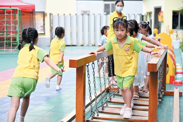 8月12日,在福建省晋江市一家民营企业的暑期托管班,孩子在老师的陪护下做游戏。制造业发达的福建省晋江市有着大量民营企业和外来务工人员。为了解决企业职工子女暑期托管和看护难题,今年暑期,晋江市出台多项支持政策,对符合条件积极参与暑期托管服务的企业和社工机构给予补贴奖励,支持社会多方共同参与暑期托管服务,为当地企业职工解除后顾之忧,确保企业生产安全有序进行。■ 新华社记者宋为伟摄